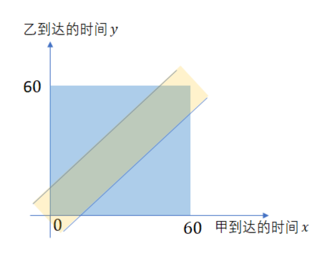 Problem. A 、 B 两人约定好晚上 6 点到 7 点之间在公园门口见面。每个人都会从这段时间当中随机挑选一个时间,并在这个时间到达公园门口。每个人都只愿意等待 15 分钟,也就是说,如果 15 分钟之后没有看见对方,那么就立即离开。那么,两人最终能见面的概率有多大?